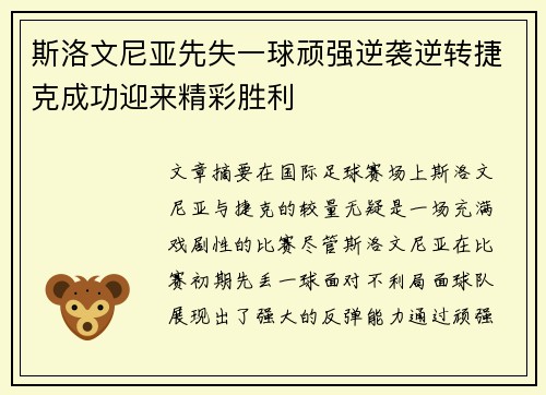 文章摘要:在国际足球赛场上,斯洛文尼亚与捷克的较量无疑是一场充满戏剧性的比赛。尽管斯洛文尼亚在比赛初期先丢一球,面对不利局面,球队展现出了强大的反弹能力,通过顽强的拼搏和战术调整,成功逆袭并最终逆转捷克,迎来了一场精彩的胜利。本文将从四个方面详细分析斯洛文尼亚如何逆转比赛的过程:首先是比赛开局阶段,斯洛文尼亚在被捷克先进一球后的心理调整;接着分析斯洛文尼亚如何通过战术变动进行反击;然后探讨球队关键球员的表现对逆转胜利的贡献;最后,总结斯洛文尼亚获胜的深层原因。这场比赛不仅展示了斯洛文尼亚顽强拼搏的精神,也为我们提供了许多关于比赛应变和团队协作的宝贵经验。